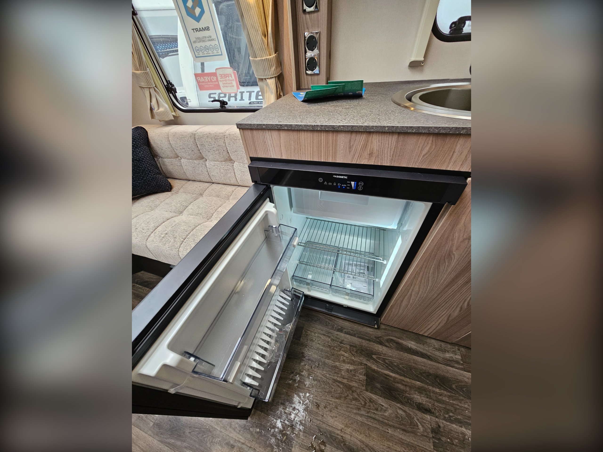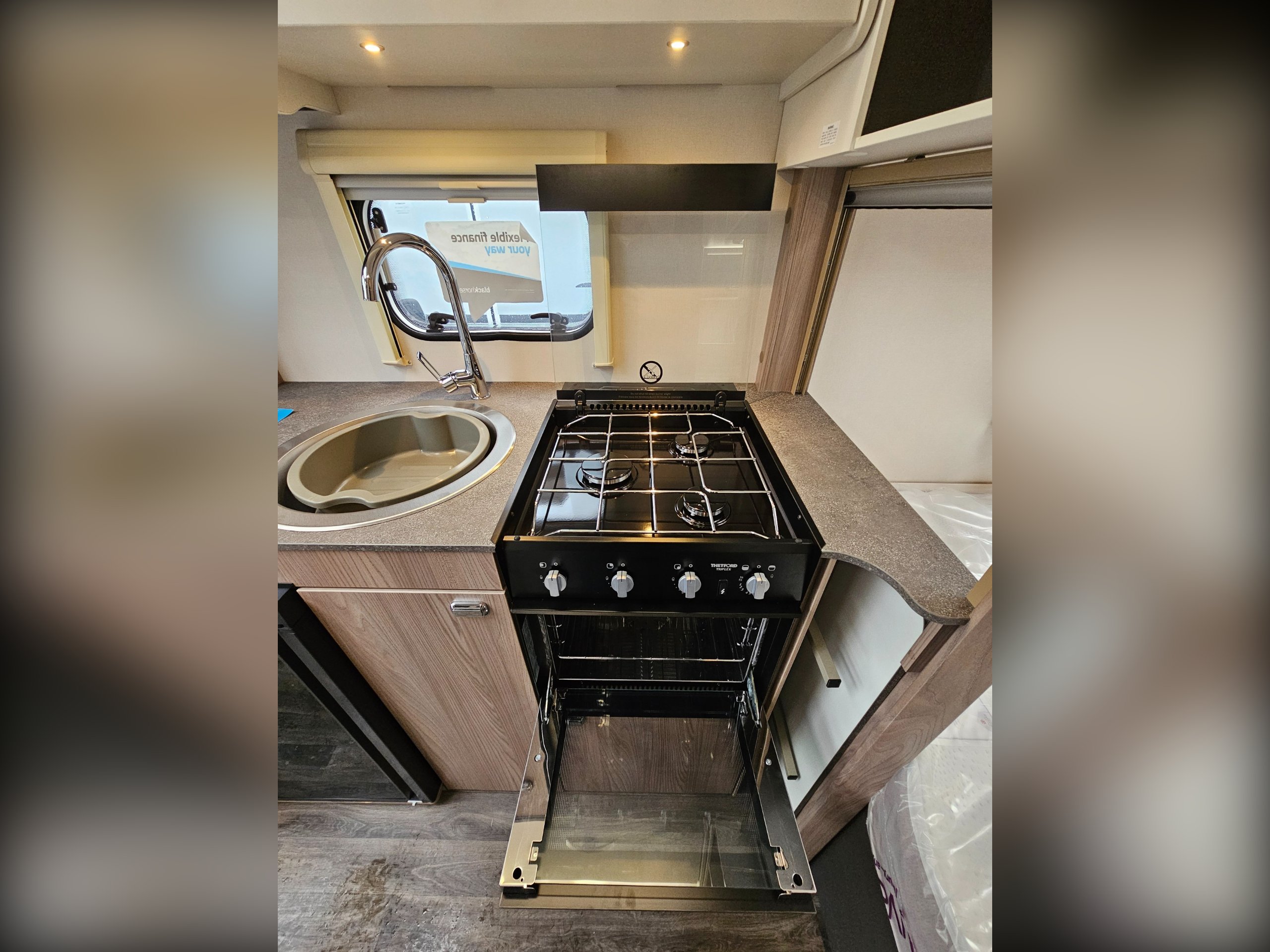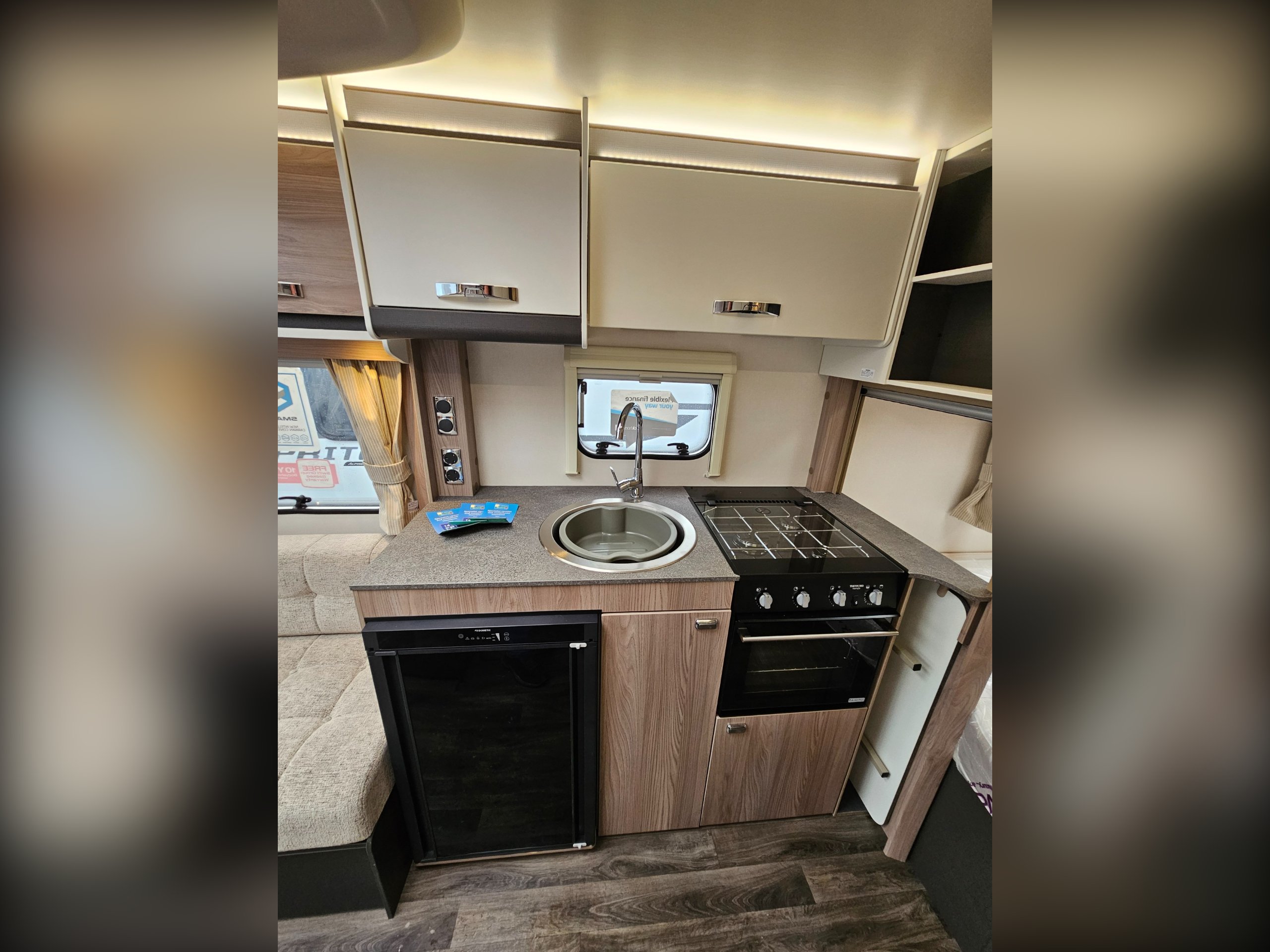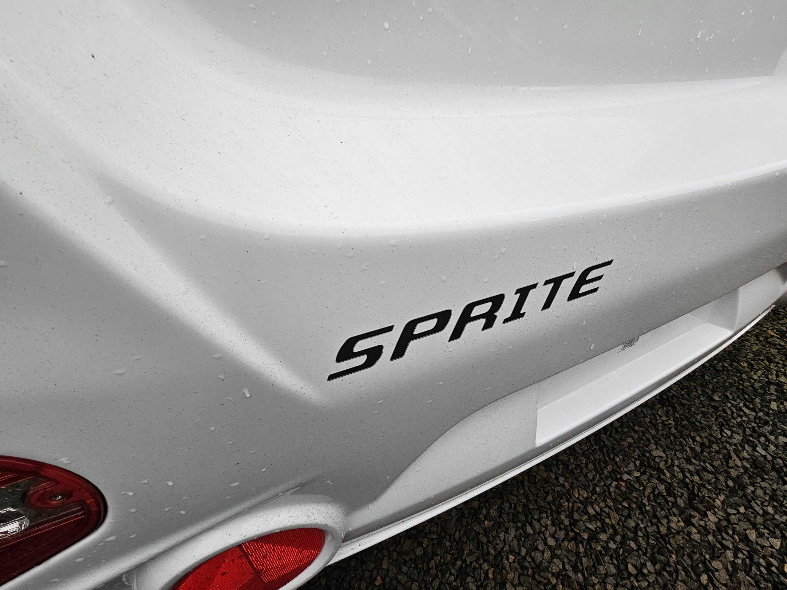 Standard Sprite specification includes...14" alloy wheels, smart grey accents and decals including a gloss grey gas locker door, LED lighting inside and out, Dometic fridge freezer, Thetford combined oven and grill along with a 3-burner gas hob. You'll also find SMART+ construction utilising GRP and PURE materials throughout minimising any timber use and 'Cherub' soft furnishings with sprung seat bases for comfort, Sangallo Elm and Toro/Grau veneers to make everything bright and airy.