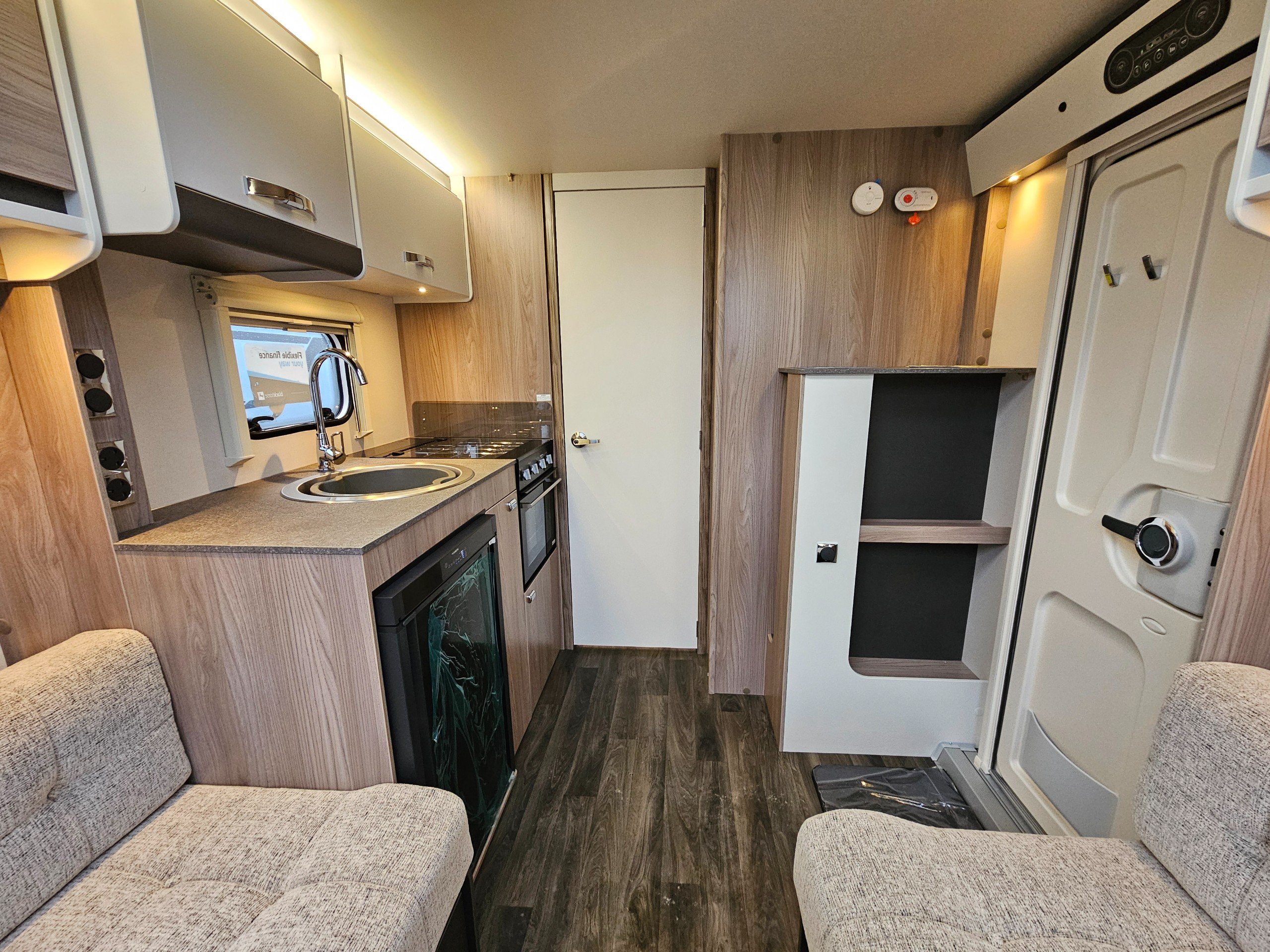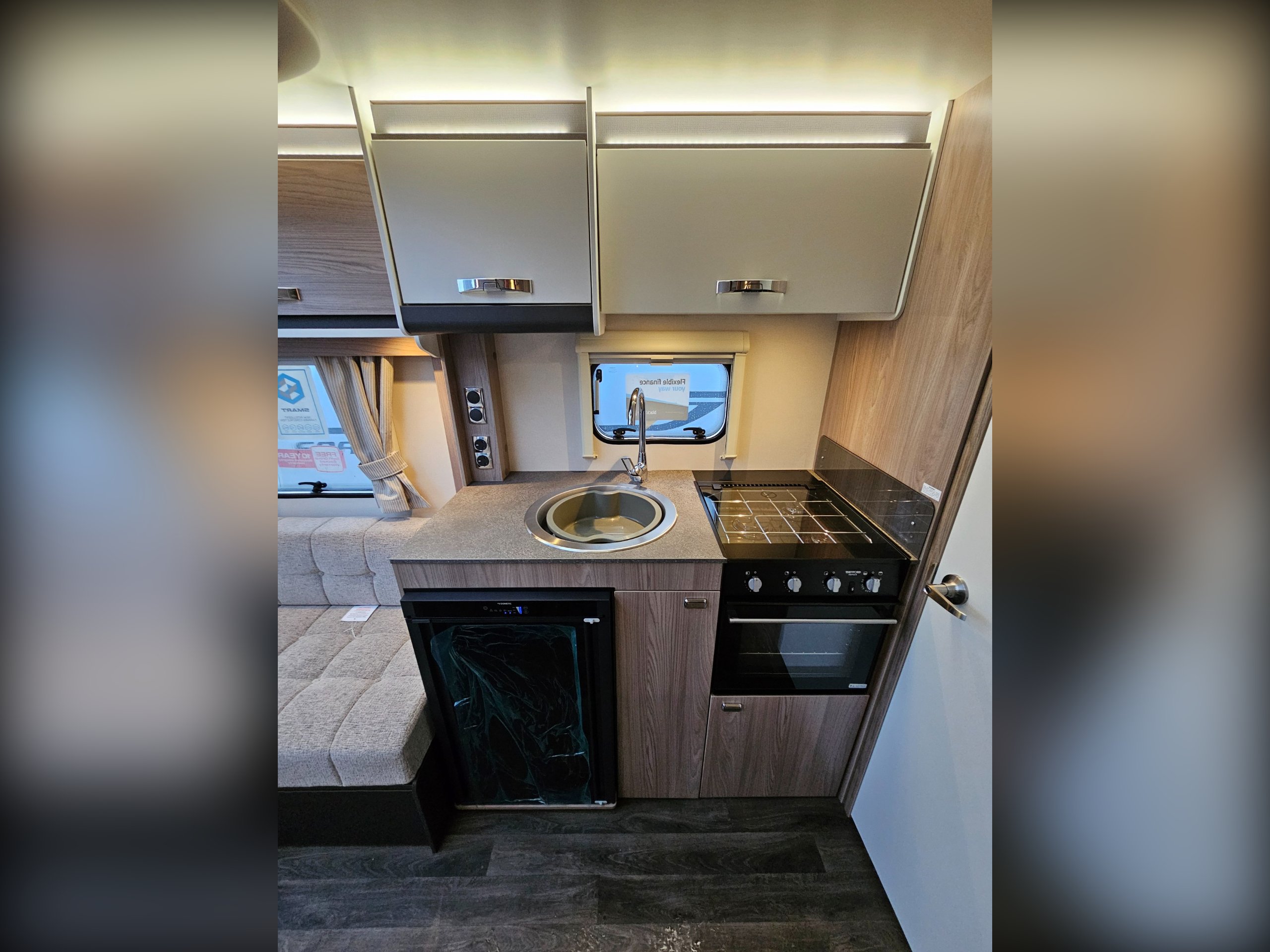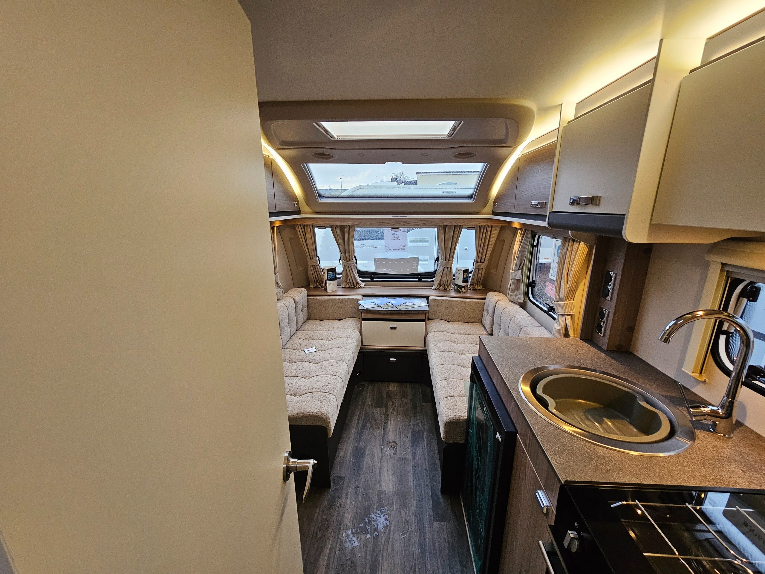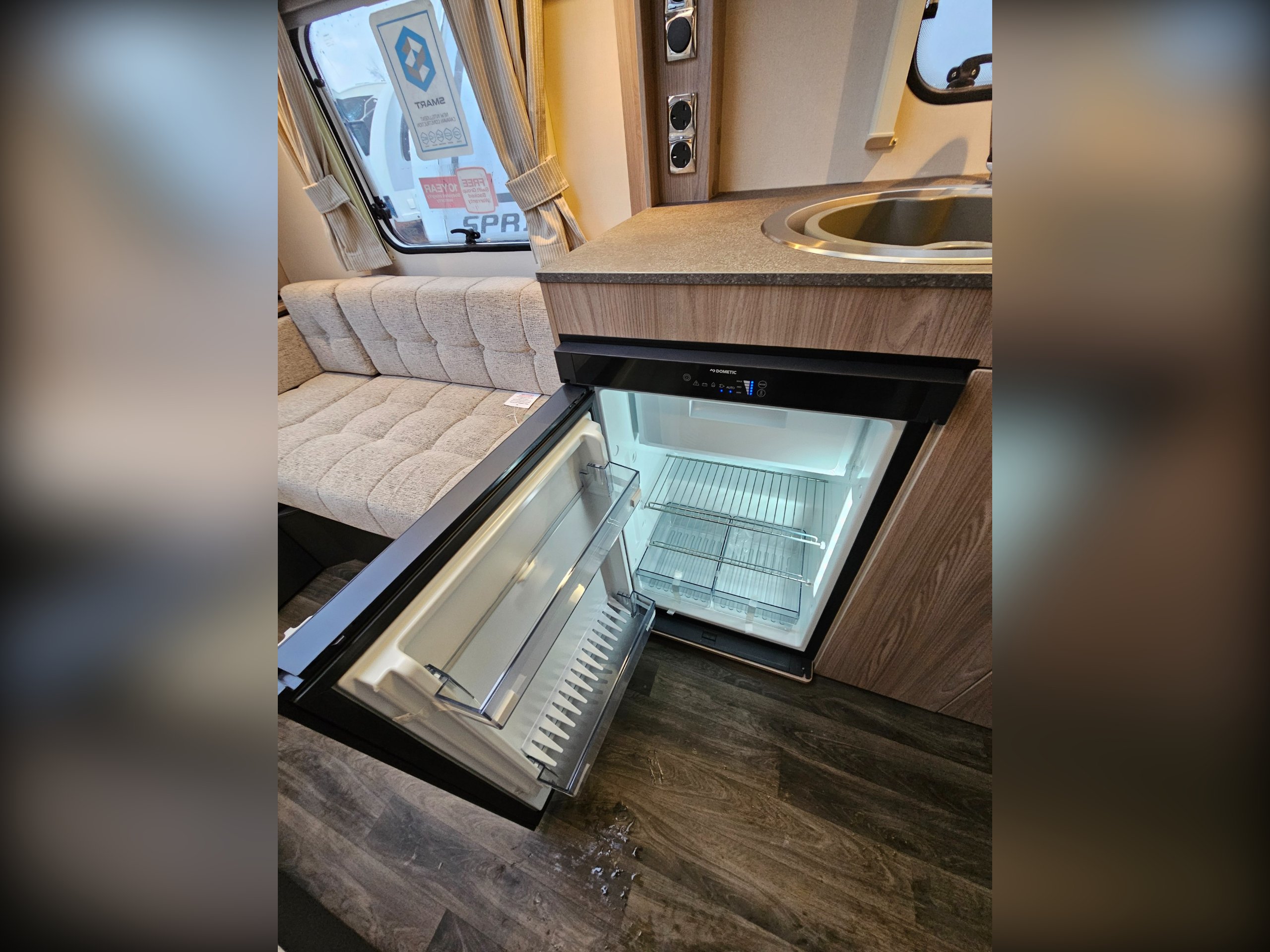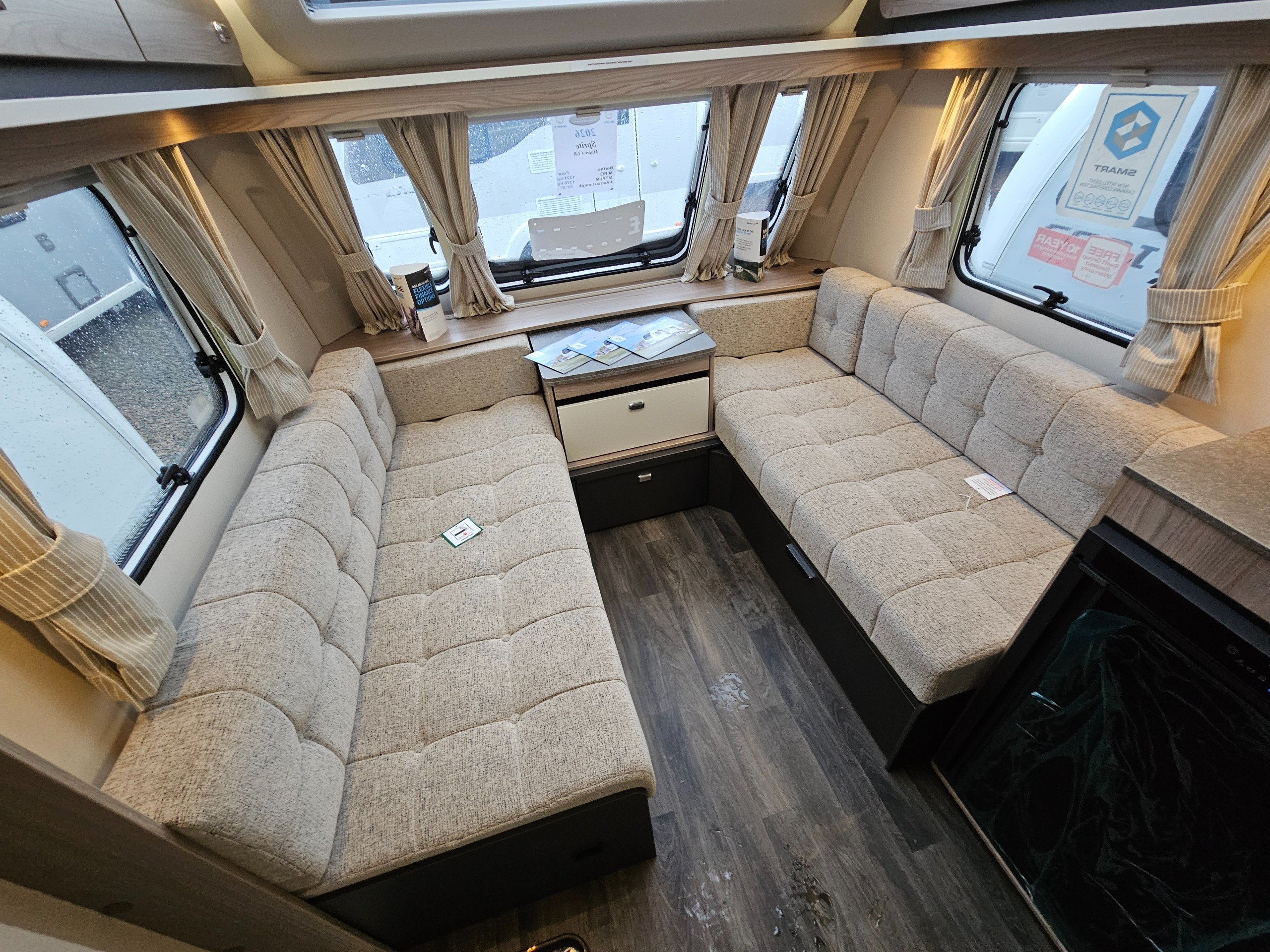 Standard Sprite specification includes...14" alloy wheels, smart grey accents and decals including a gloss grey gas locker door, LED lighting inside and out, Dometic fridge freezer, Thetford combined oven and grill along with a 3-burner gas hob. You'll also find SMART+ construction utilising GRP and PURE materials throughout minimising any timber use and 'Cherub' soft furnishings with sprung seat bases for comfort, Sangallo Elm and Toro/Grau veneers to make everything bright and airy.