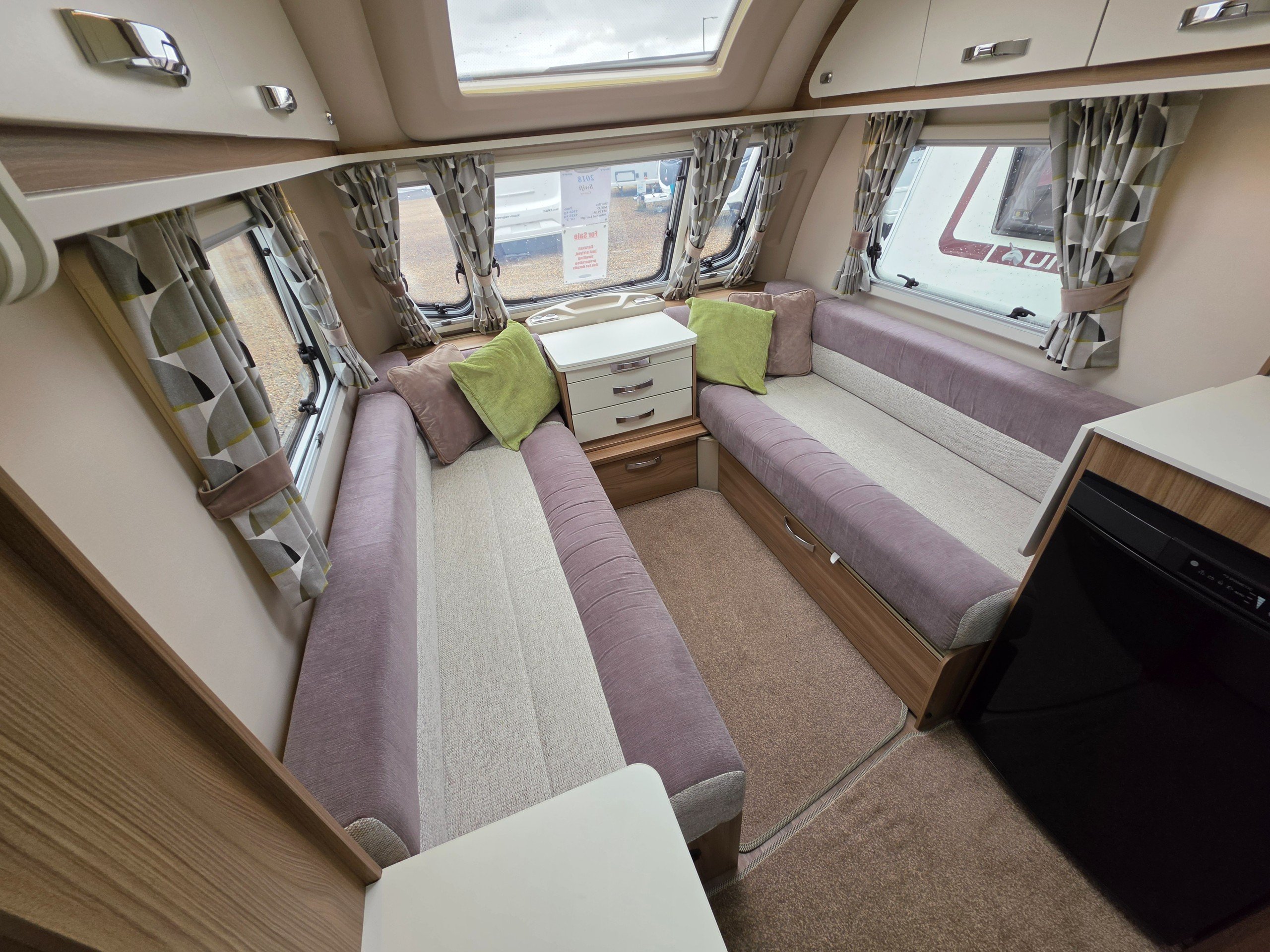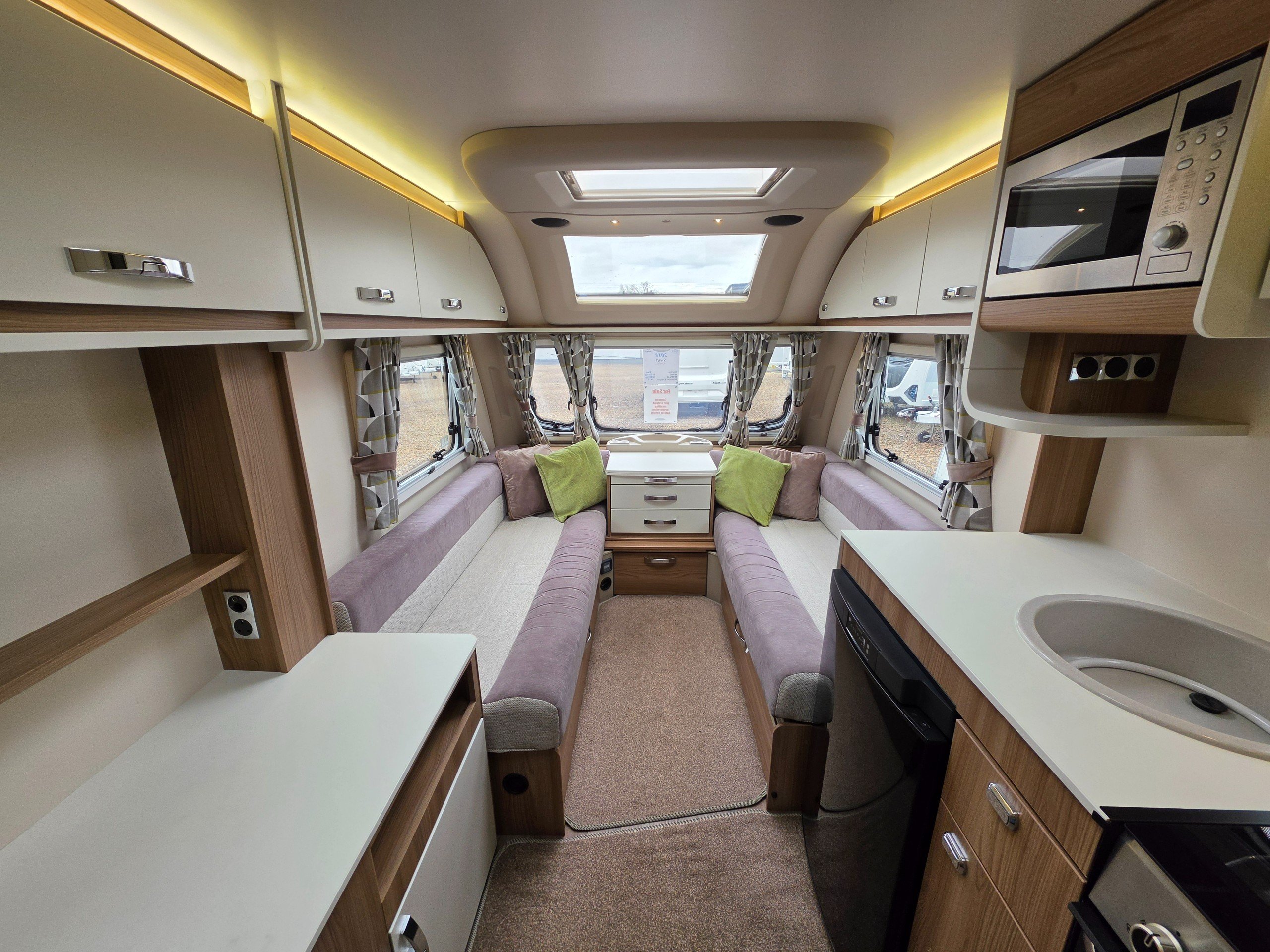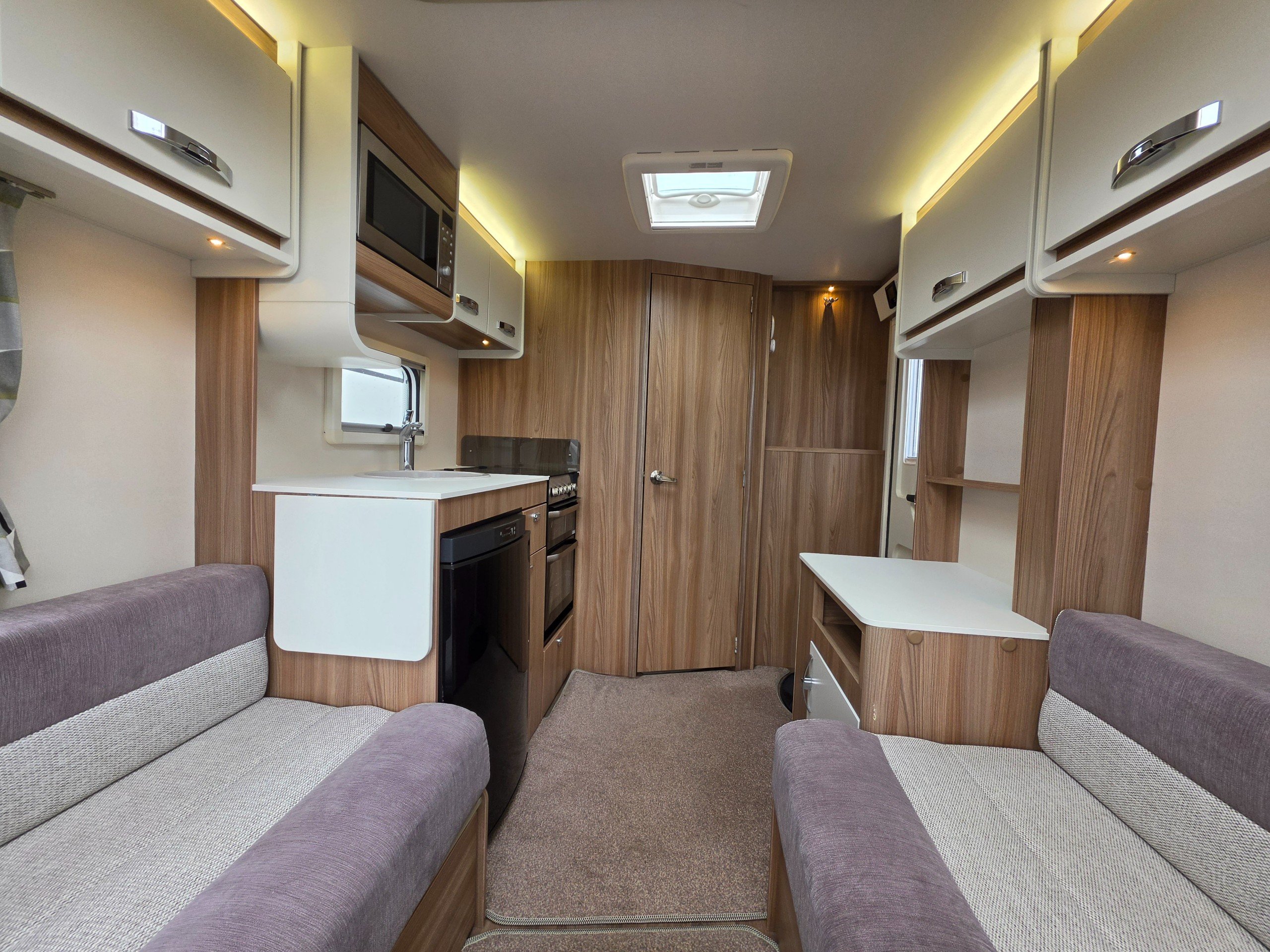 This is a 2-berth caravan with long parallel seats in the lounge area, spacious kitchen to the offside with another worktop/TV area opposite and a large washroom to the rear.
