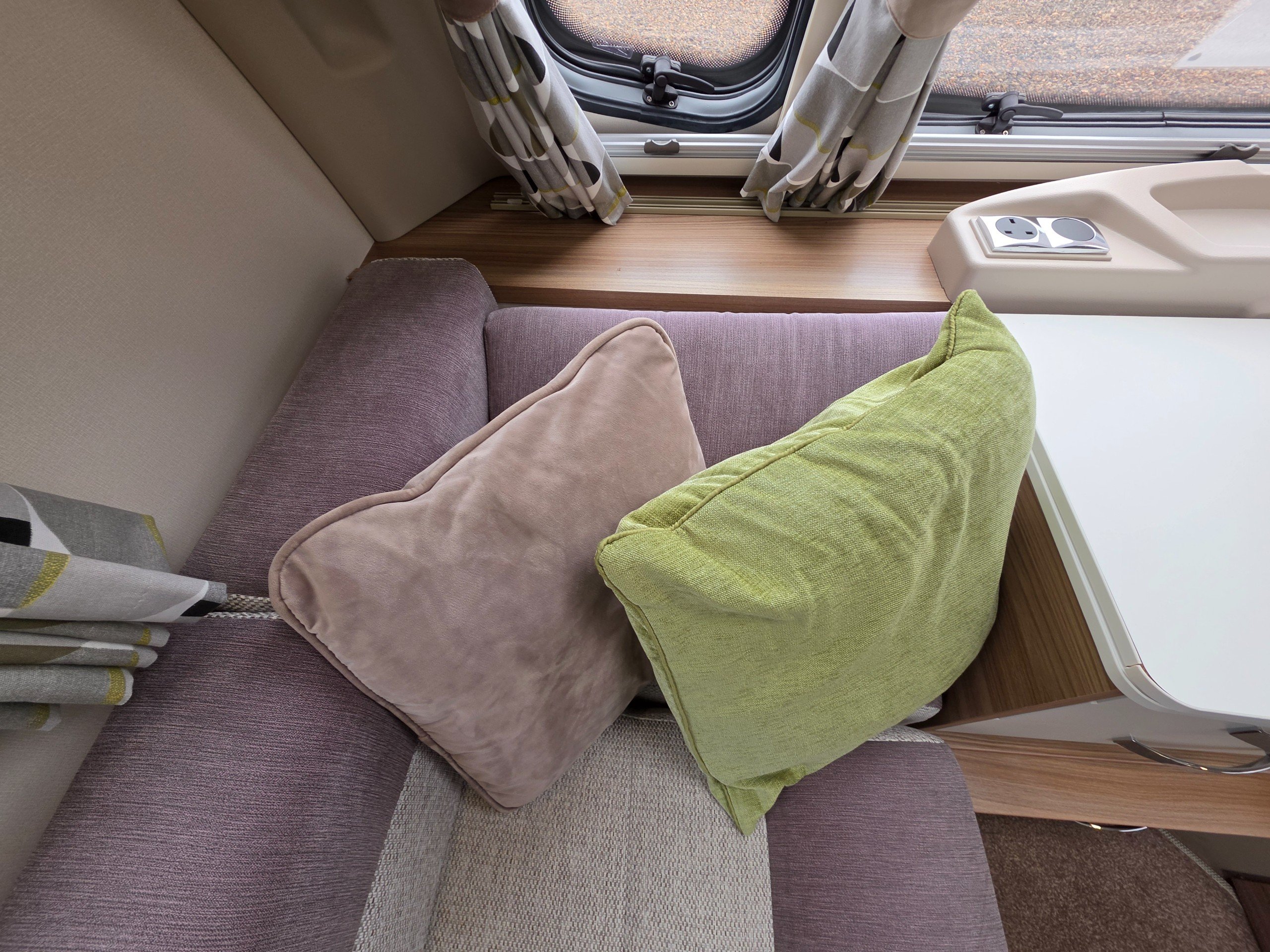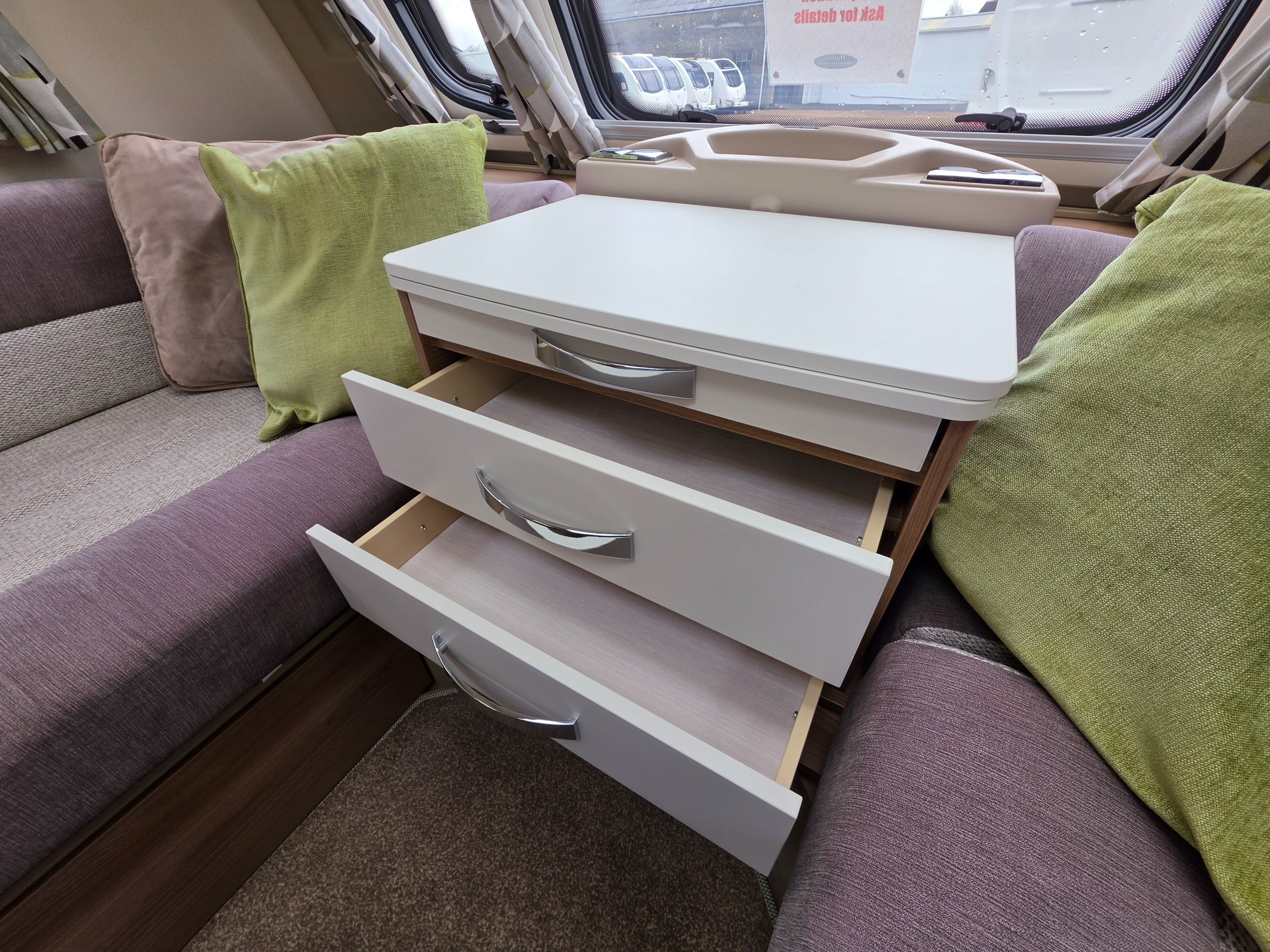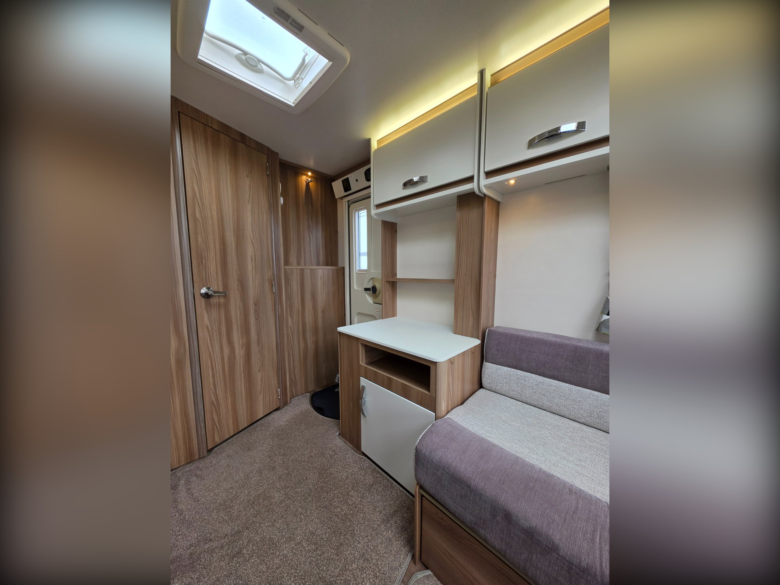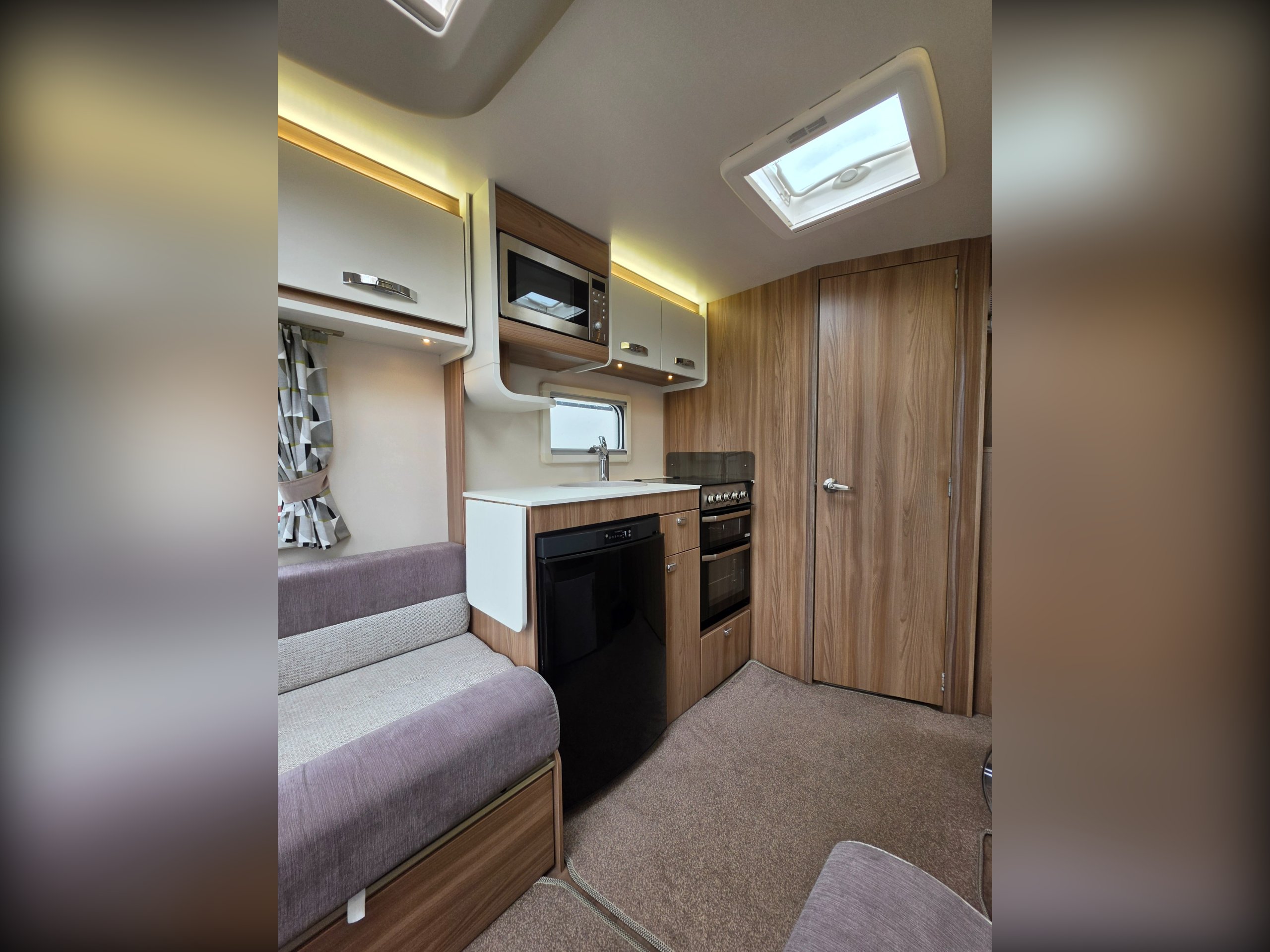 This is a 2-berth caravan with long parallel seats in the lounge area, spacious kitchen to the offside with another worktop/TV area opposite and a large washroom to the rear.