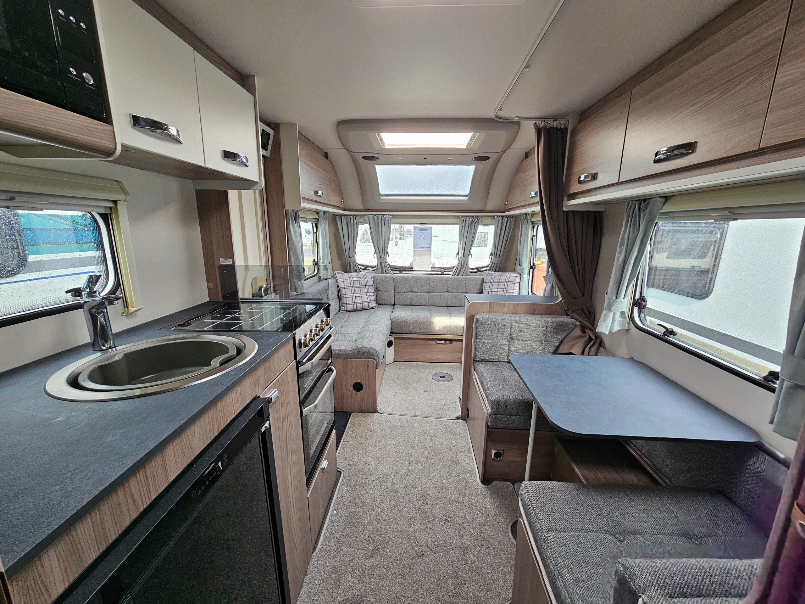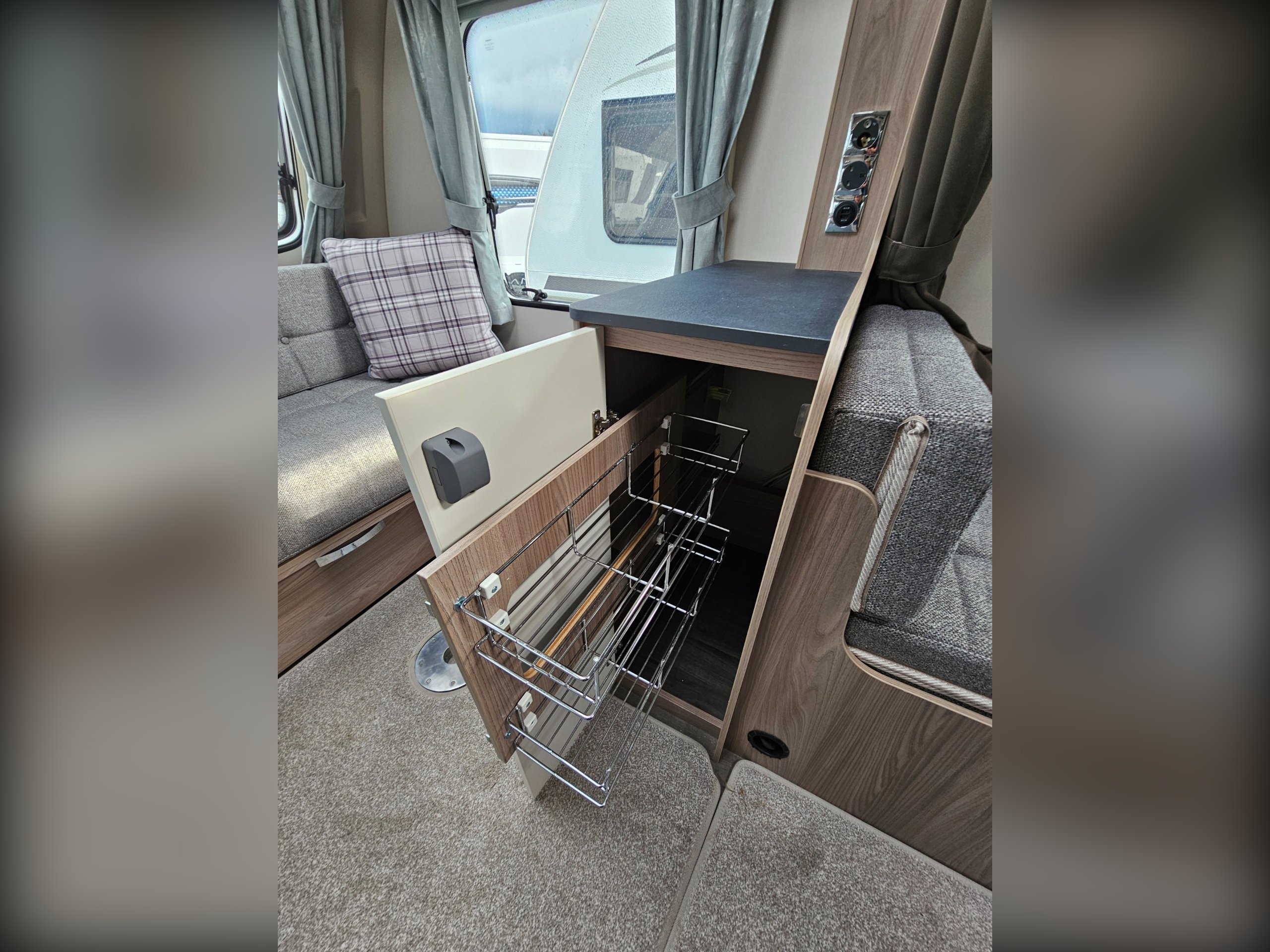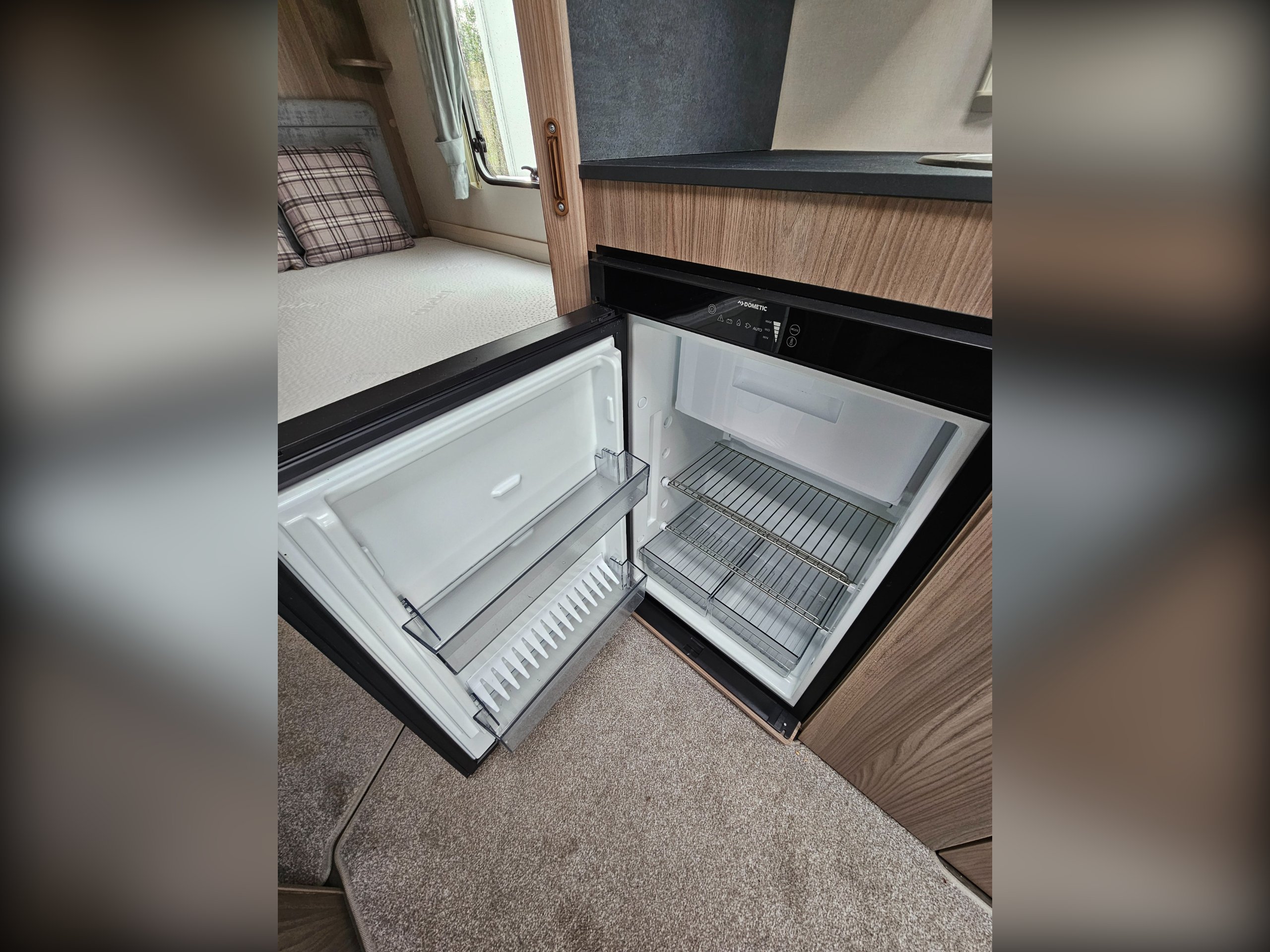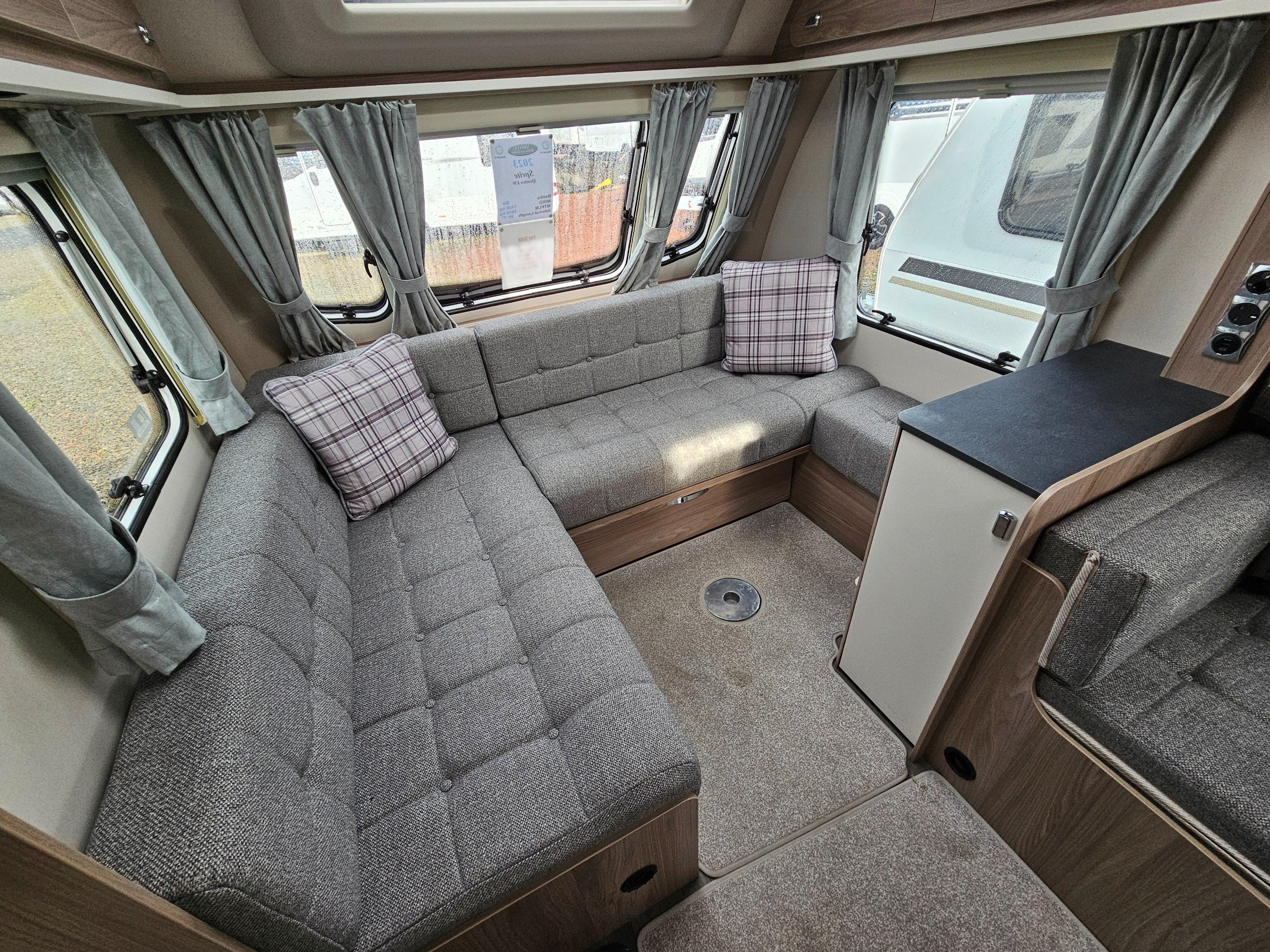 Being a 2023 model, you'll find the same Truma Combi heating system found in current Sprite caravans as well as a simplified control panel above the entrance door. You'll find a JVC, blue-tooth enabled stereo as well as a Maxview directional TV aerial. Microwave and gas cooking options in the kitchen along with a Dometic under-counter fridge/freezer. You'll find a bright and airy fabric option with slate grey worktops.